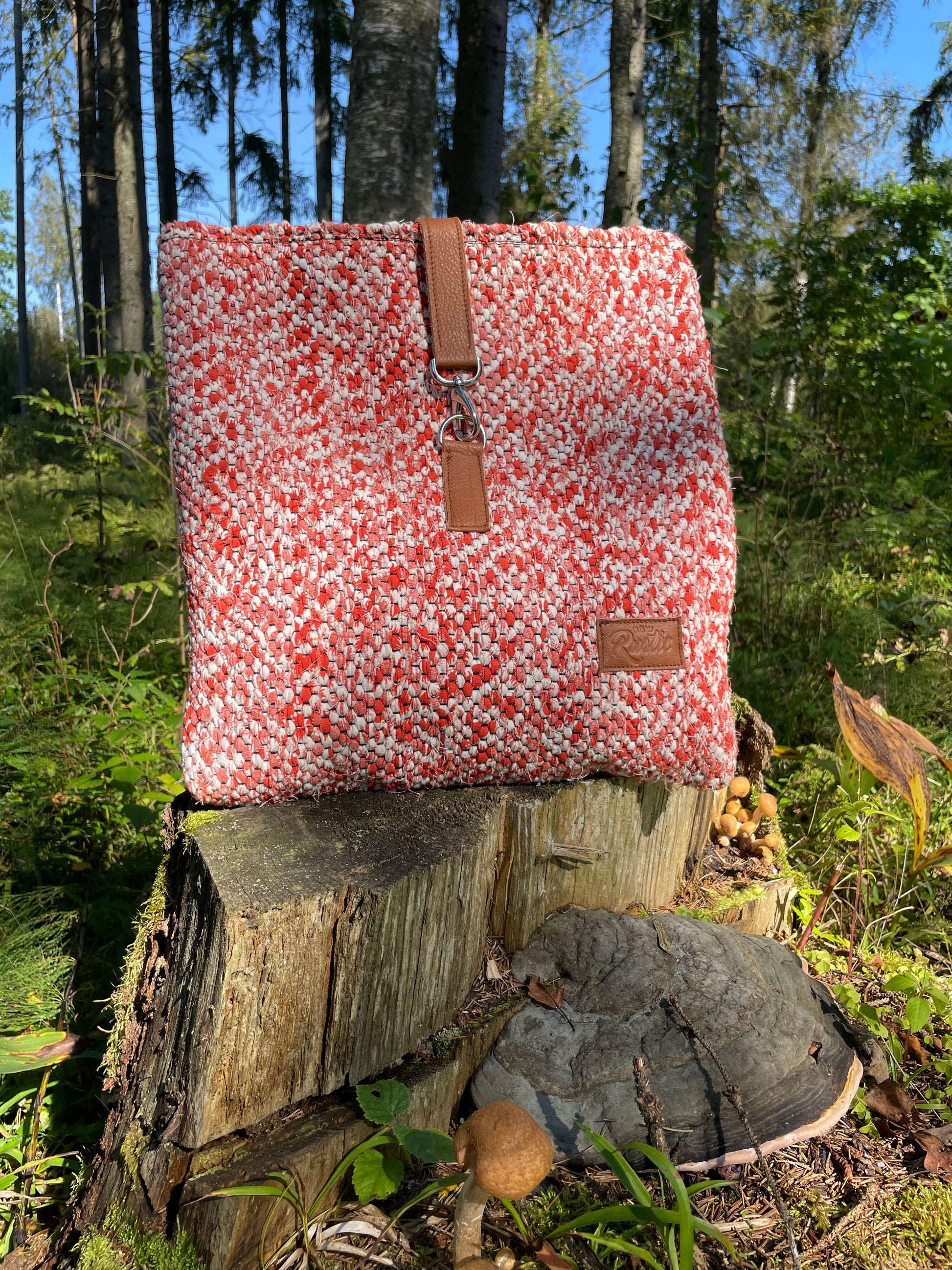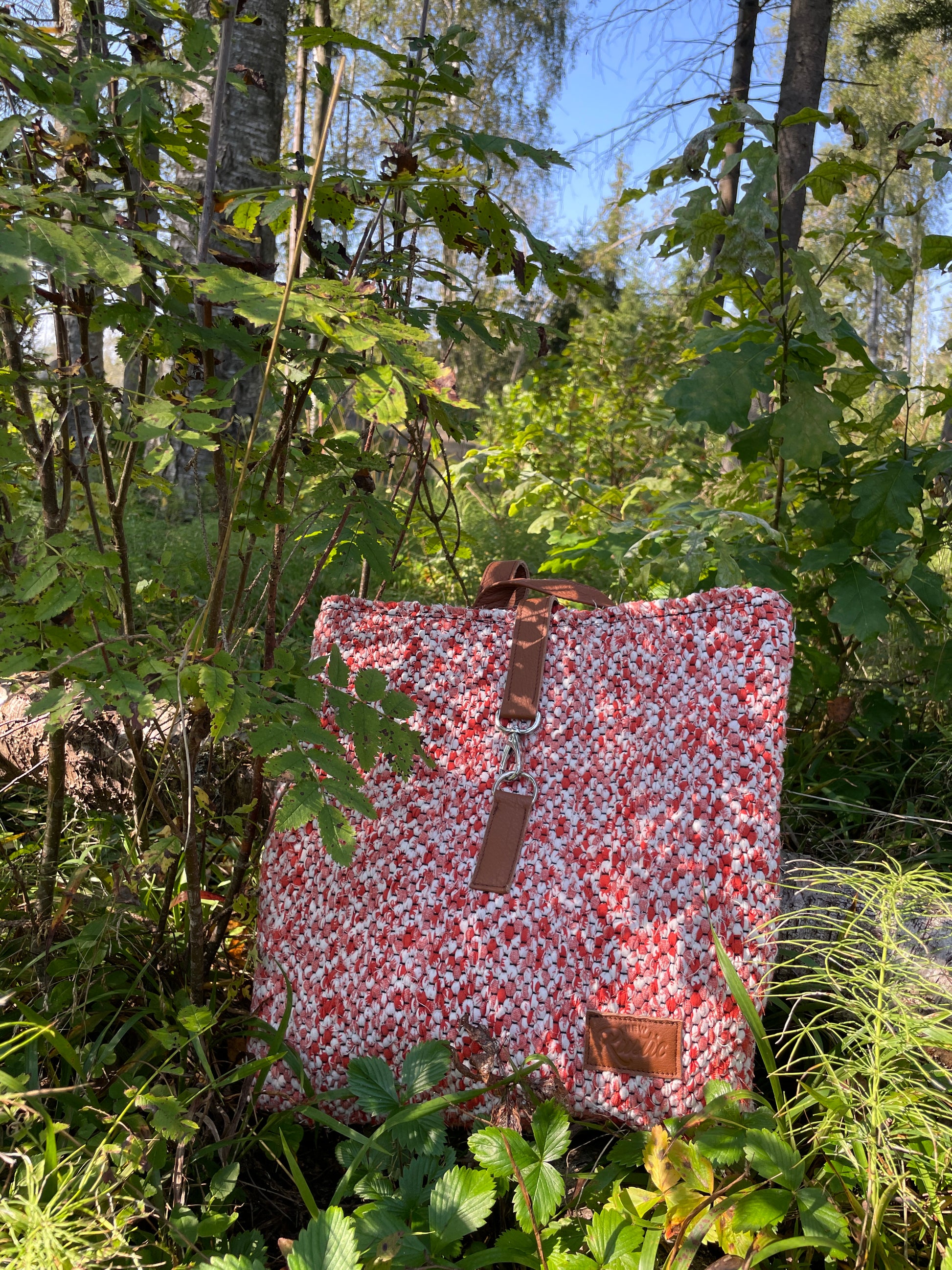 The backpack is woven from a white and purple variegated fabric, with dark purple and gray fringe inside. The leather details of the backpack are black and the waterproof lining is dark blue.
