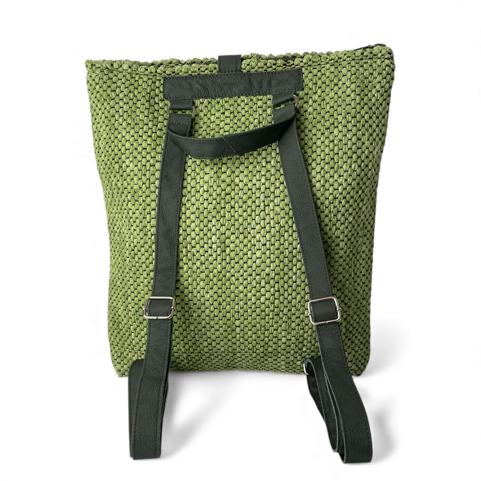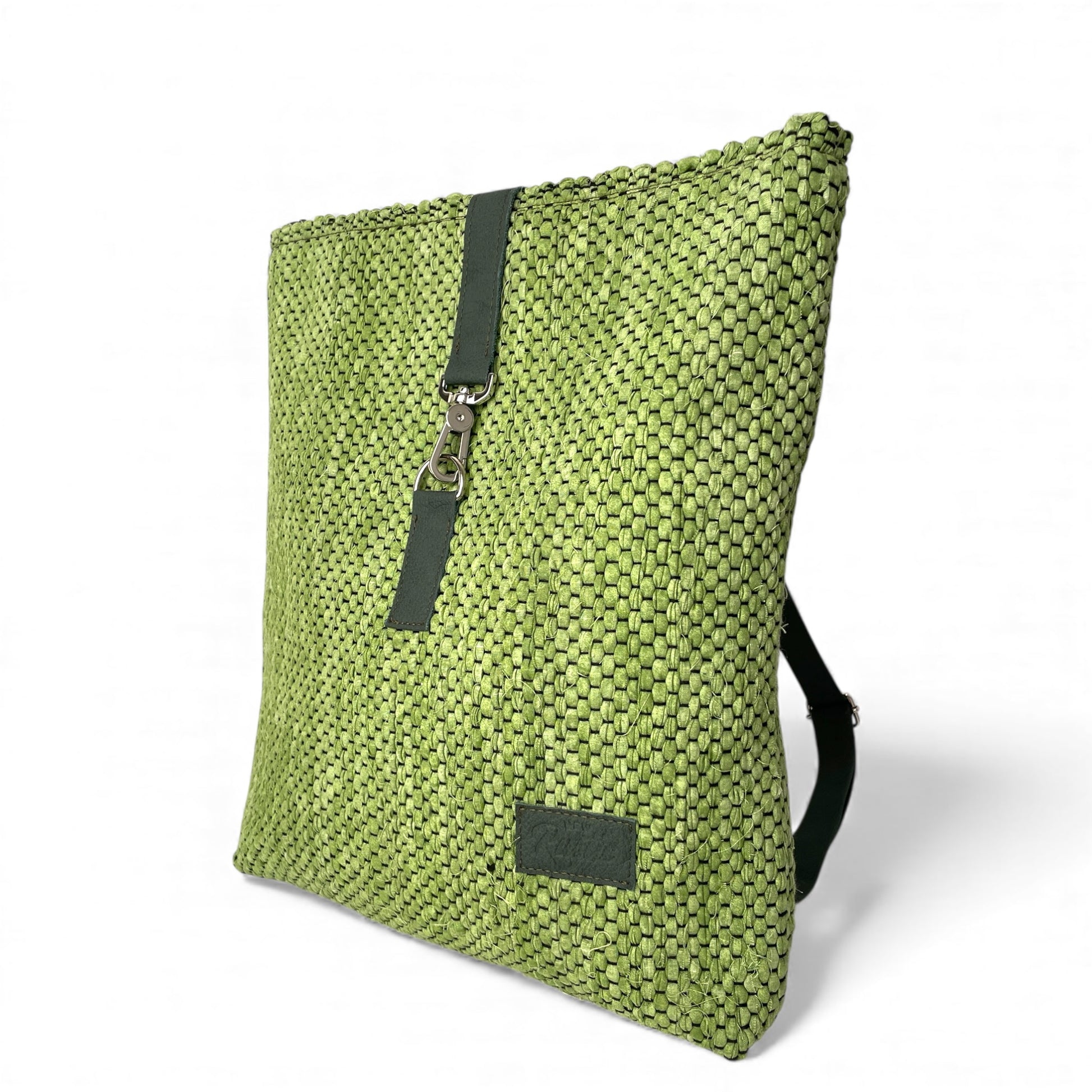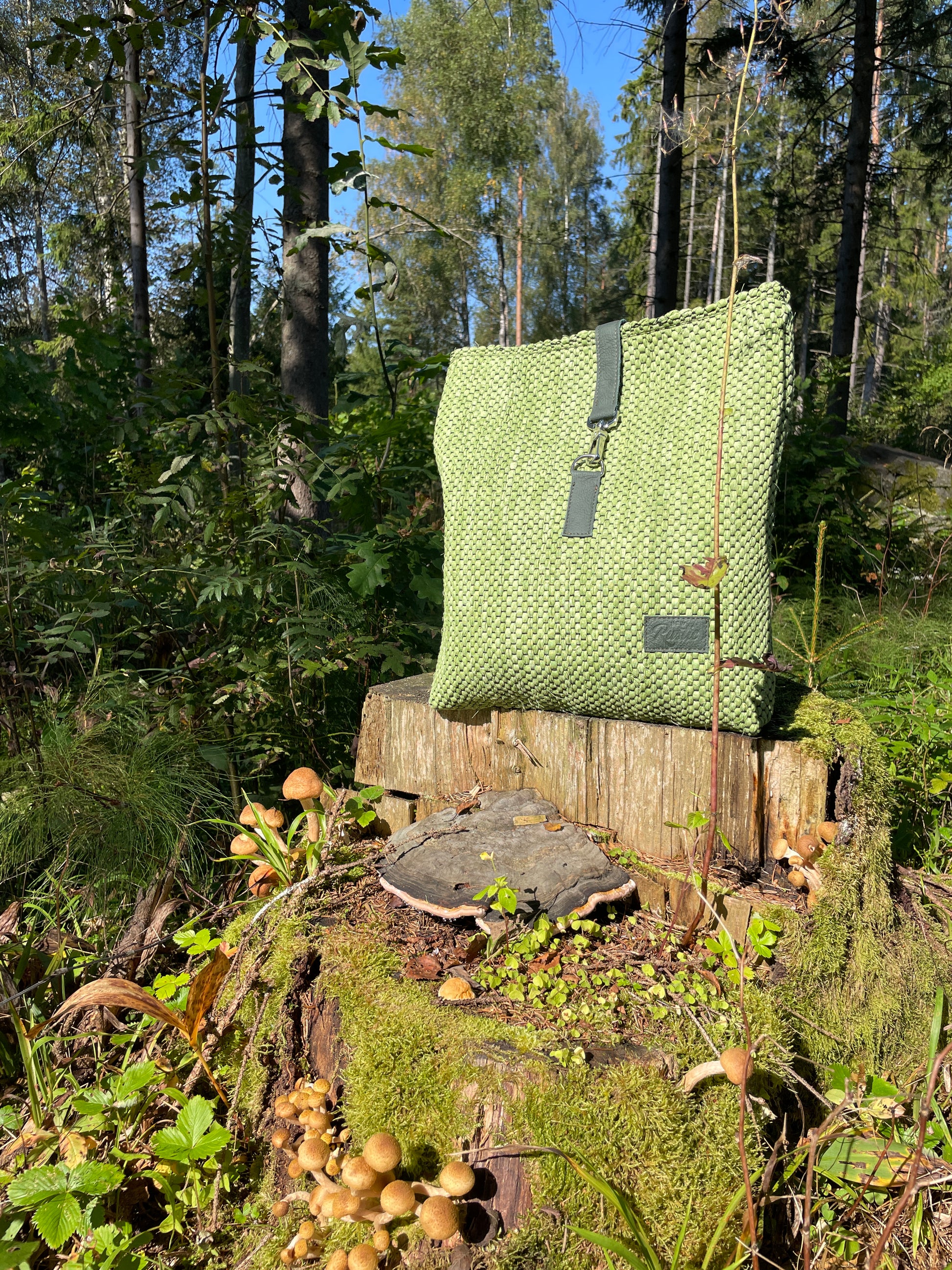 Kangastelgedel kootud seljakoti kangas on salatiroheline. Seljakoti nahast detailid on tumerohelist värvi.