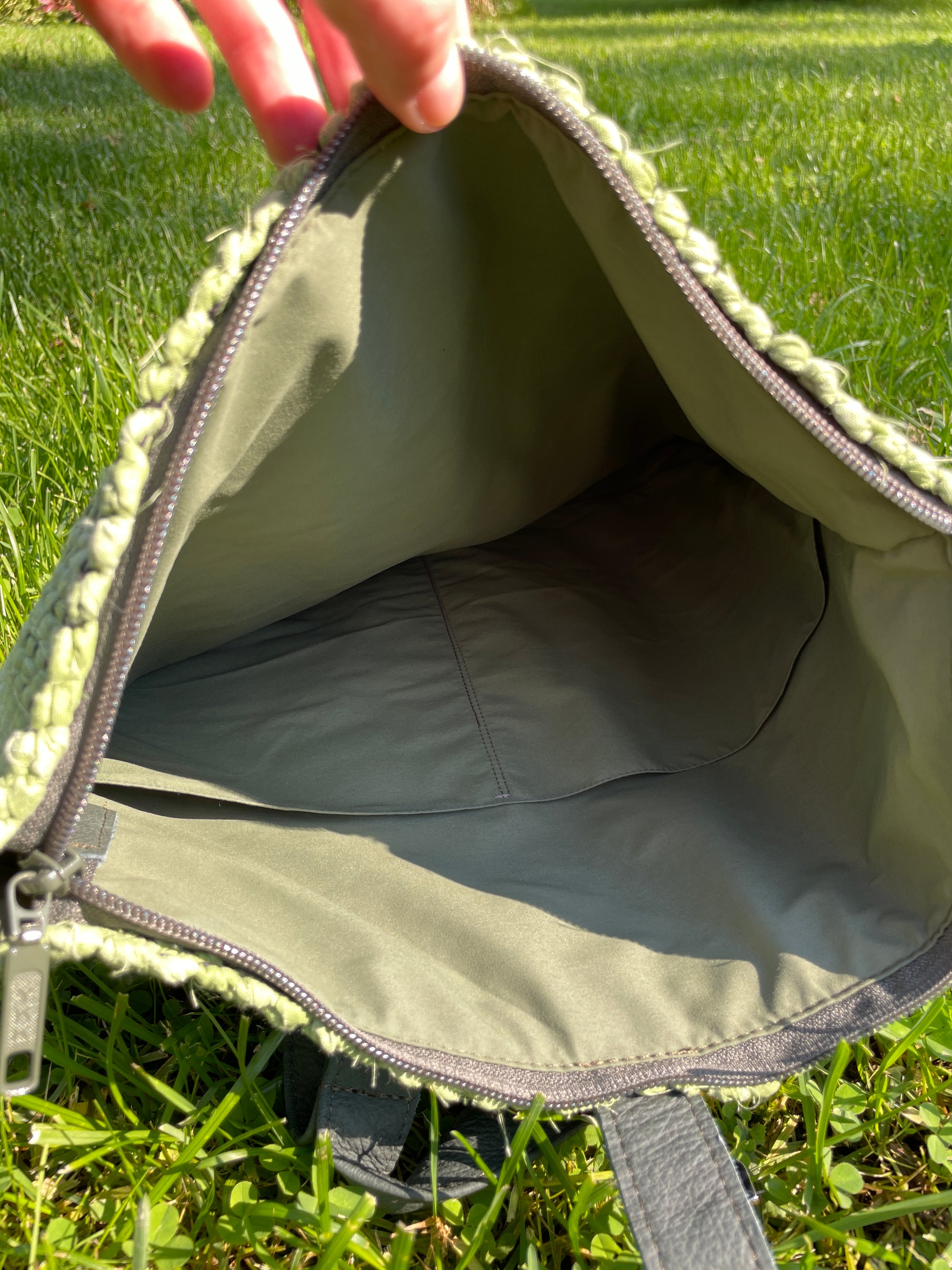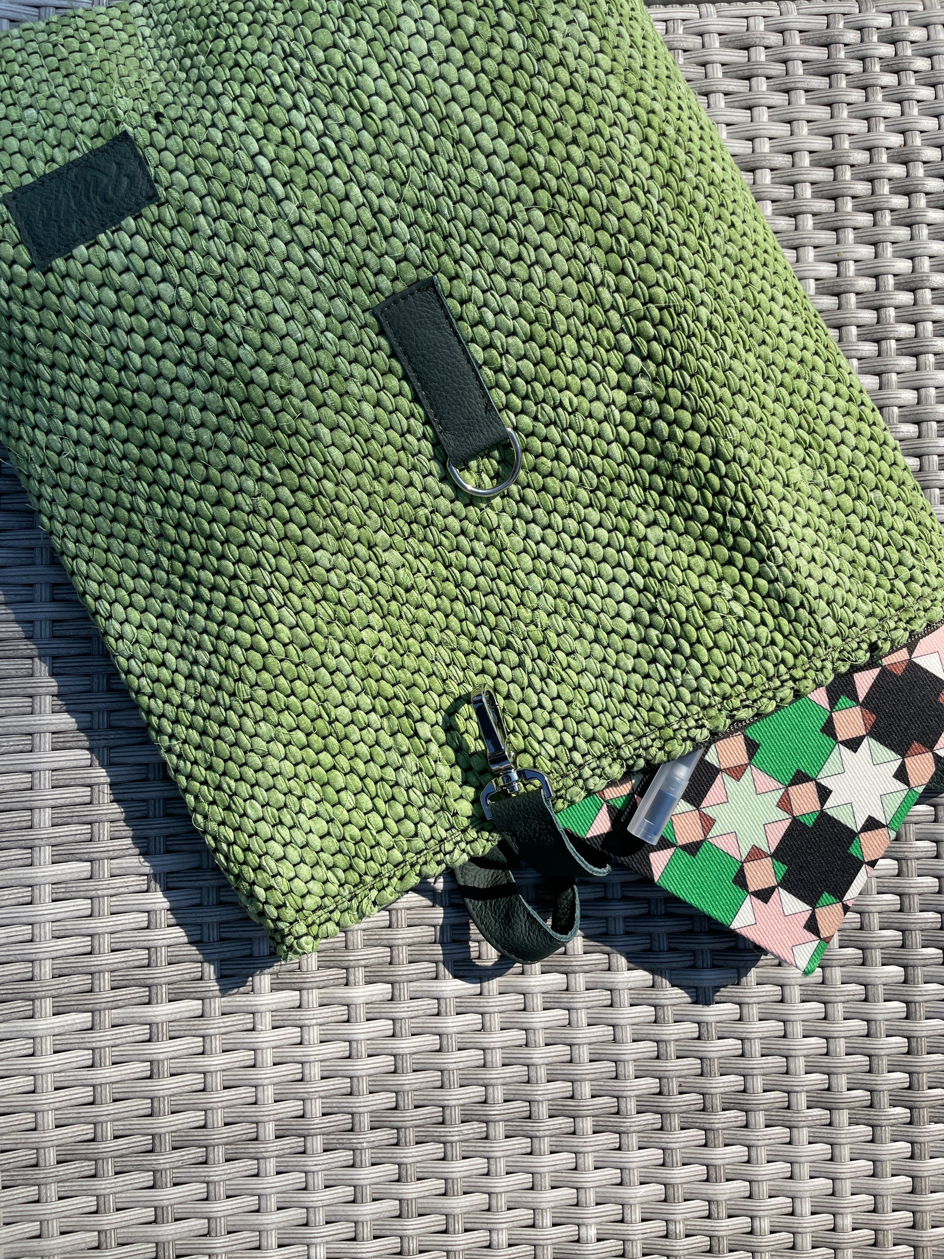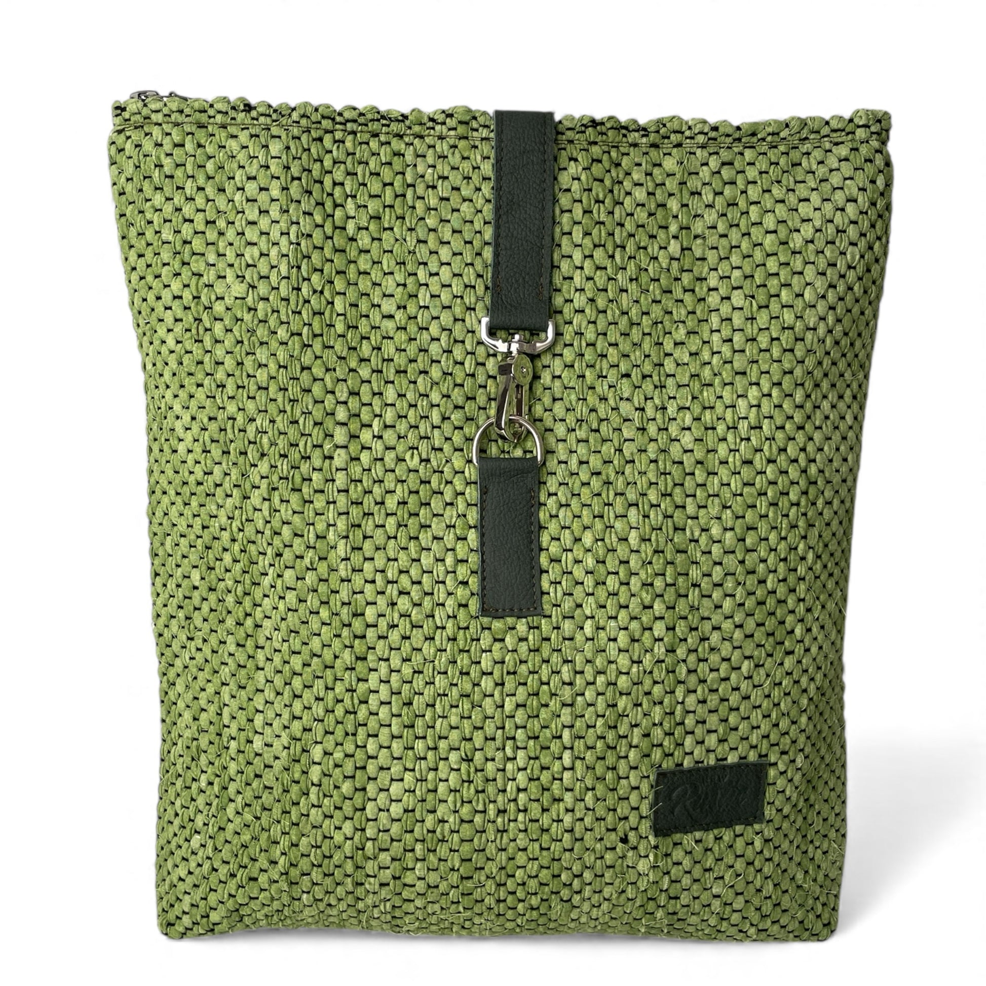 Kangastelgedel kootud seljakoti kangas on salatiroheline. Seljakoti nahast detailid on tumerohelist värvi.