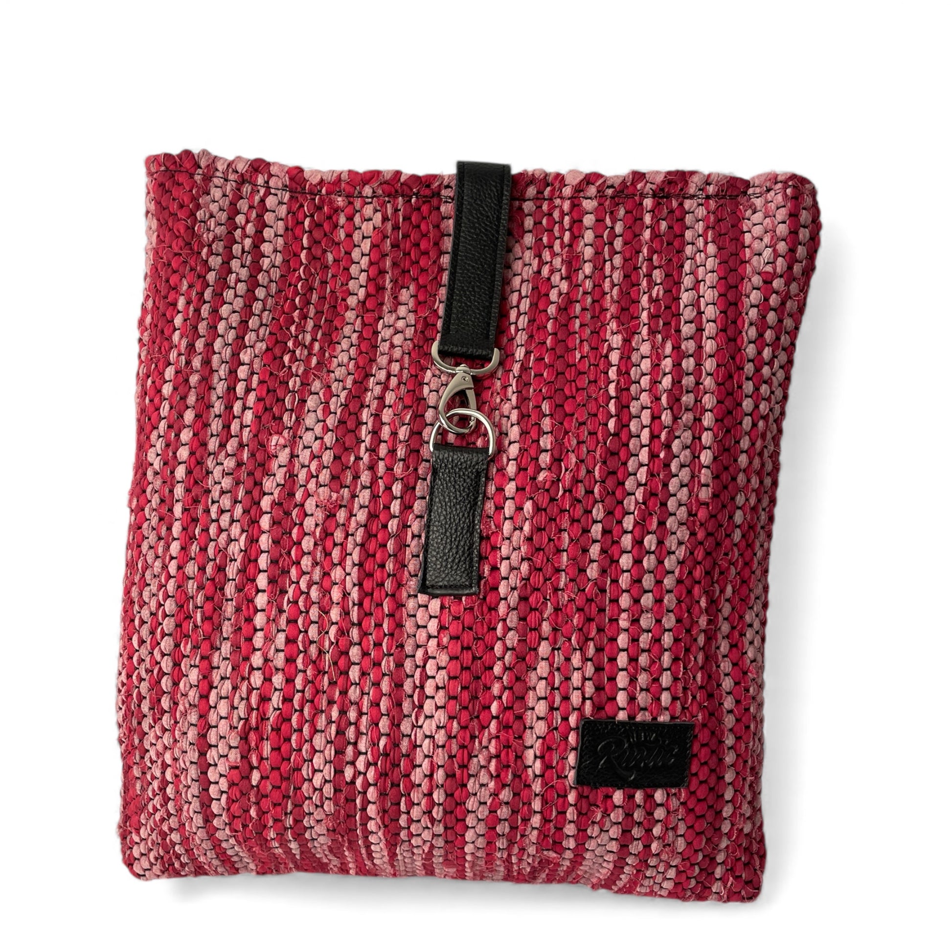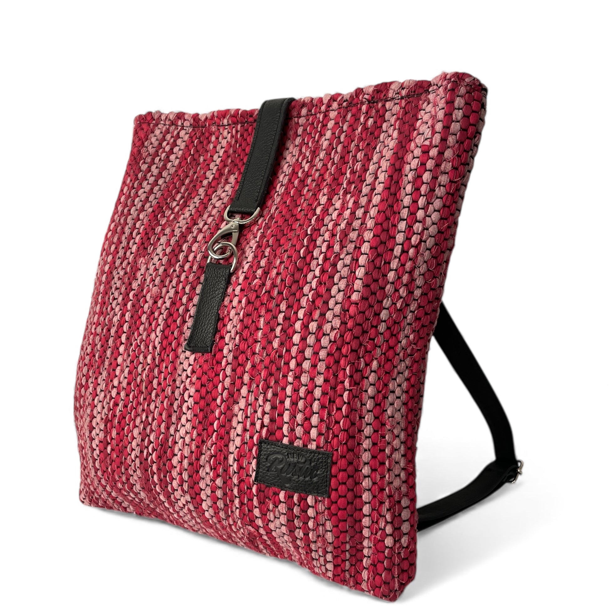 Kangastelgedel kootud seljakoti kangas on punane, mille sees valge säbru. Seljakoti nahast detailid on musta värvi.