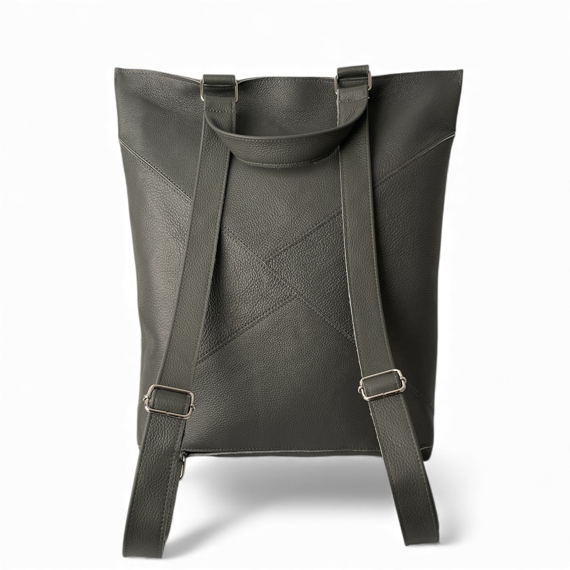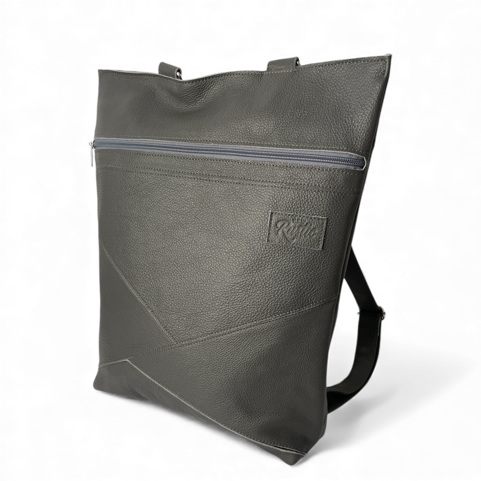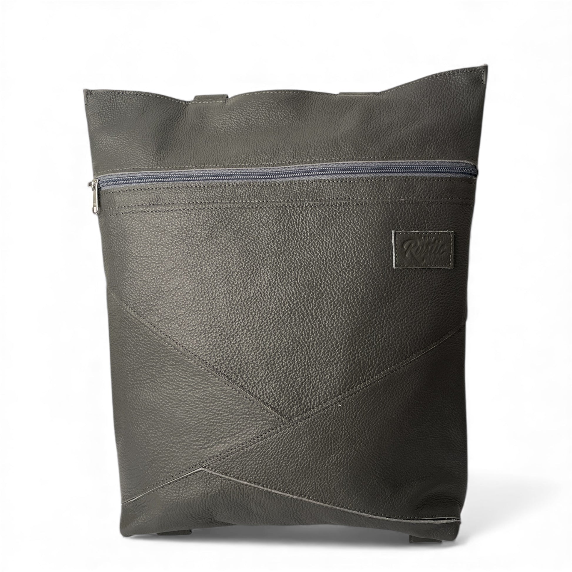 Mängulise nahast seljakott on õmmeldud hallist nahast. Koti nahast sangad on hallid.