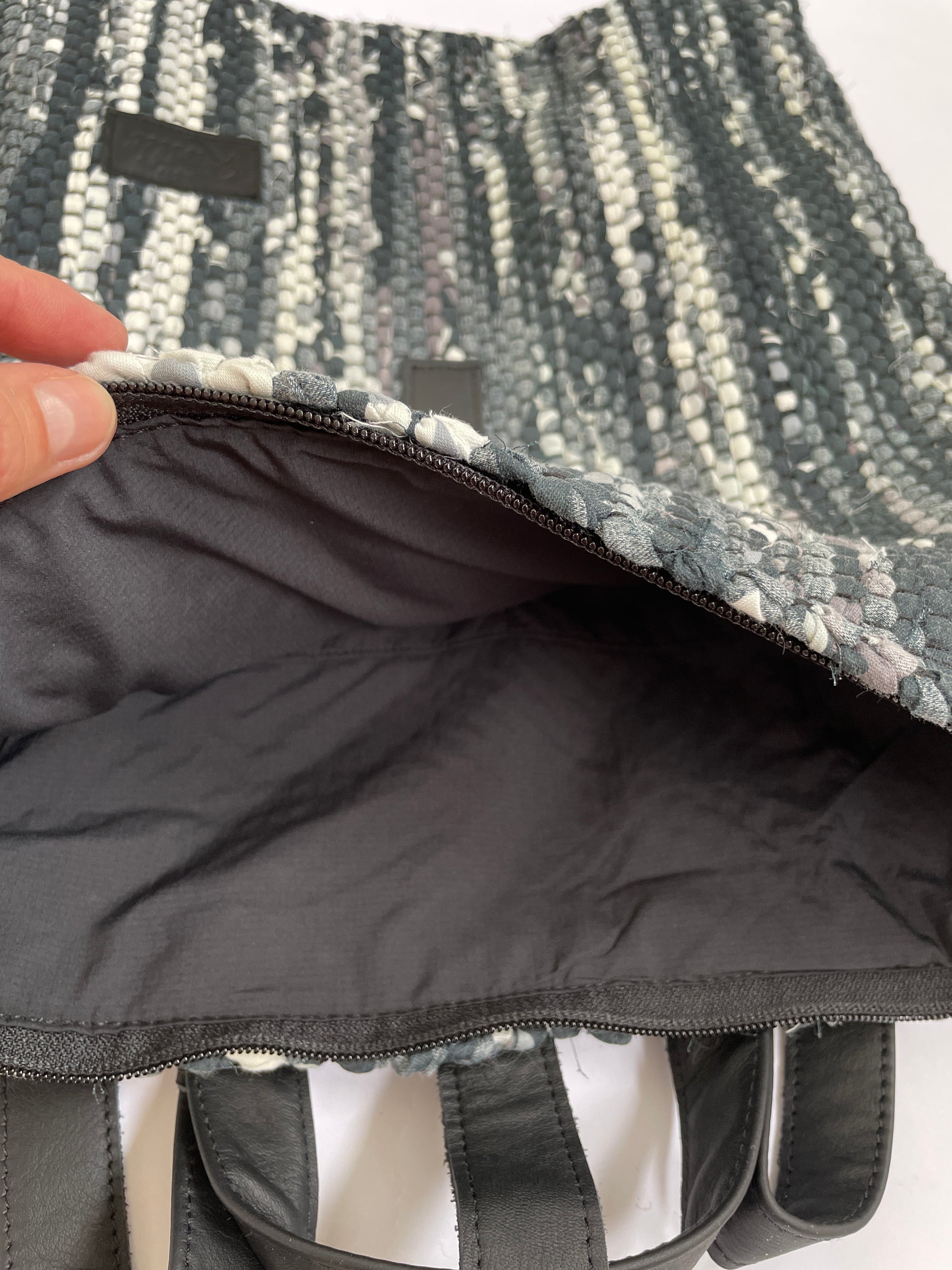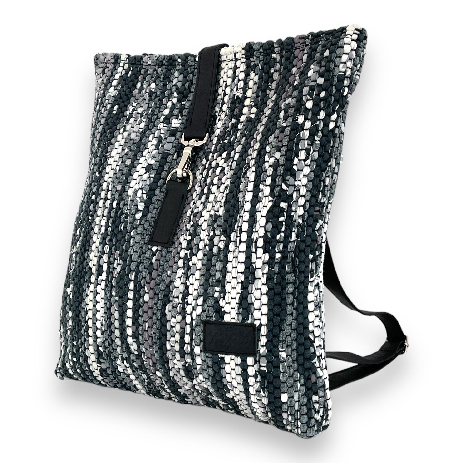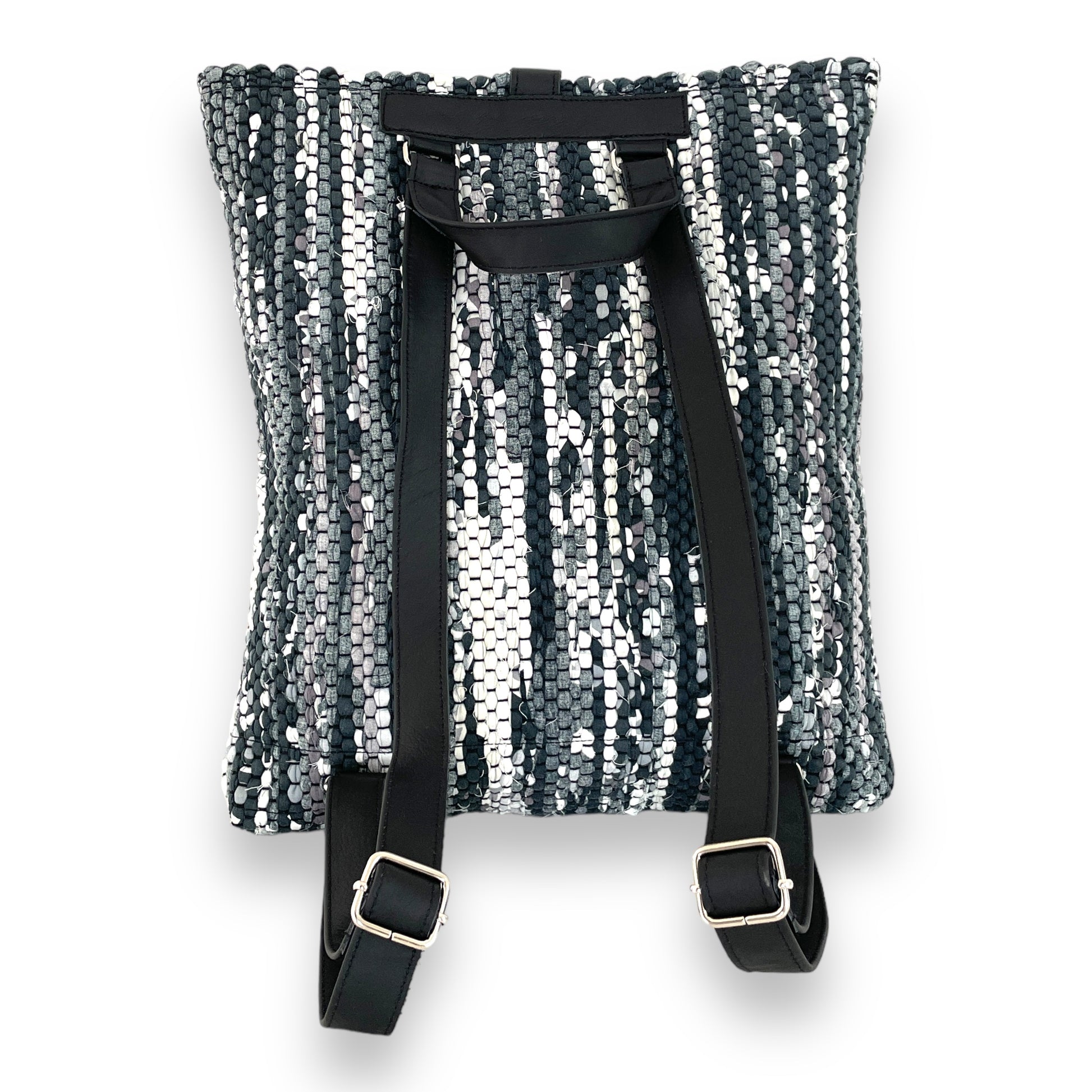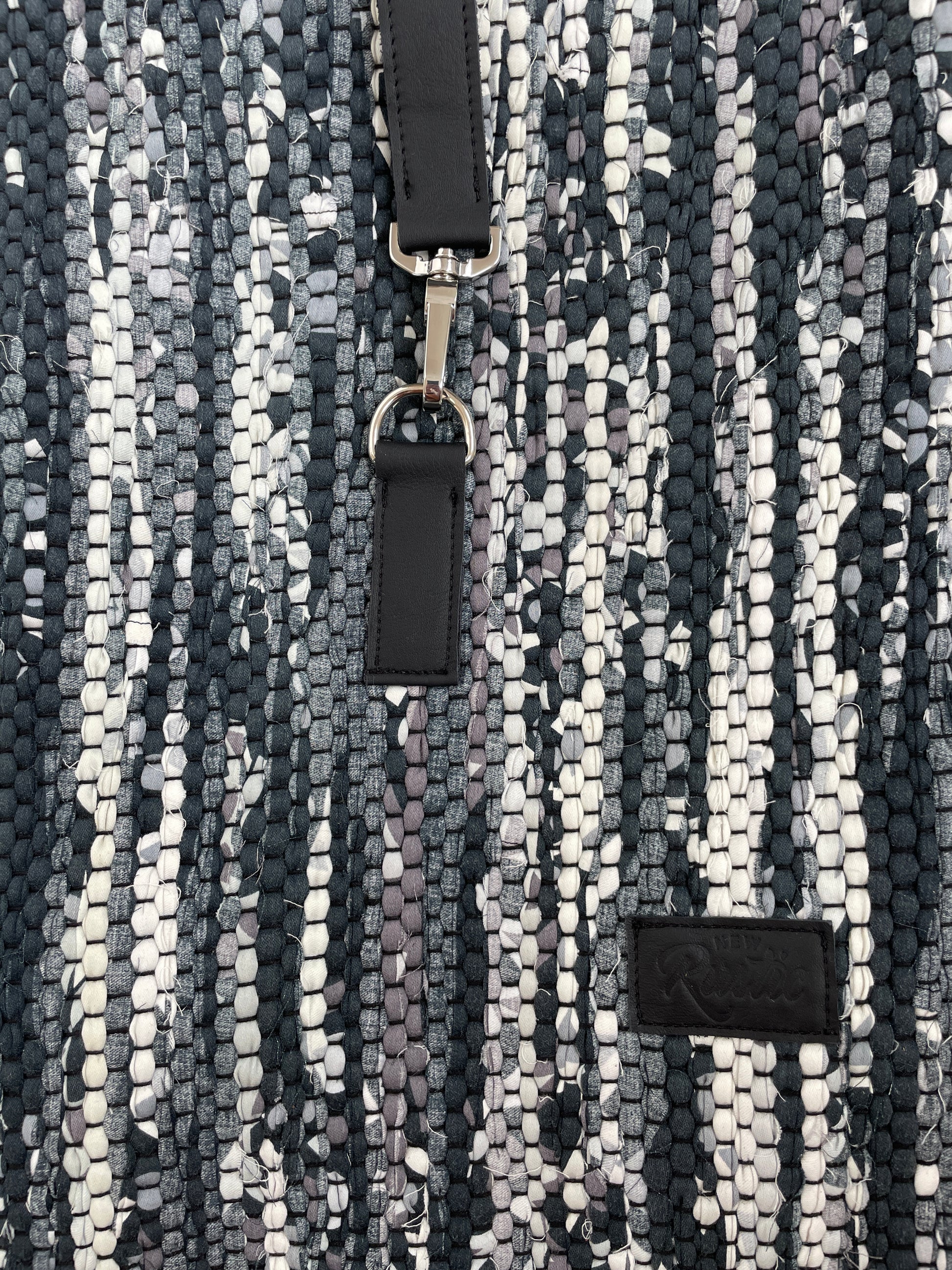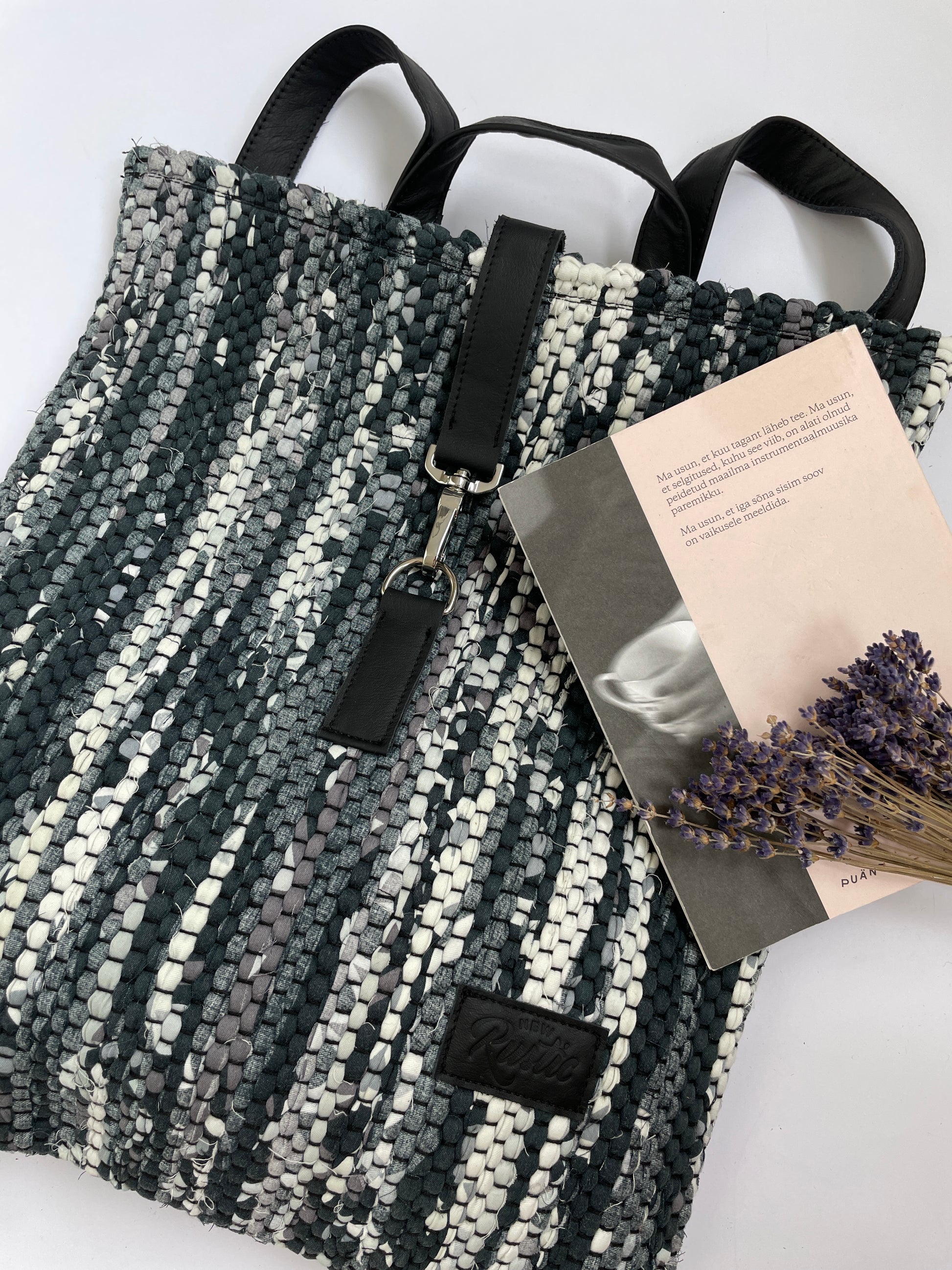 Kangastelgedel kootud seljakoti kangas on musta, halli ja valge kirju. Seljakoti nahast detailid ja veekindel vooder on musta värvi.