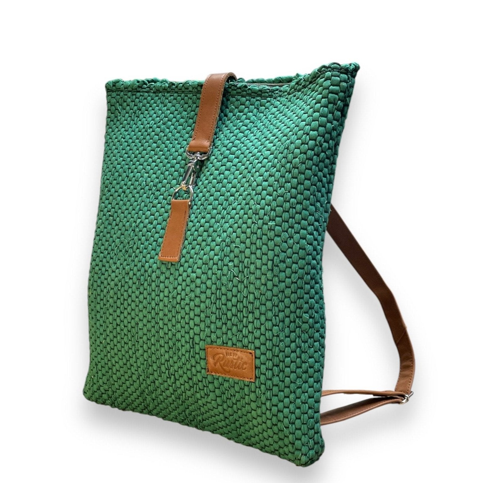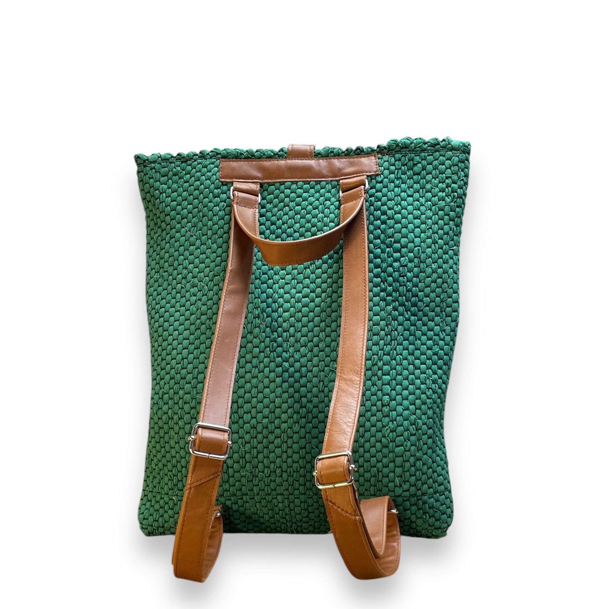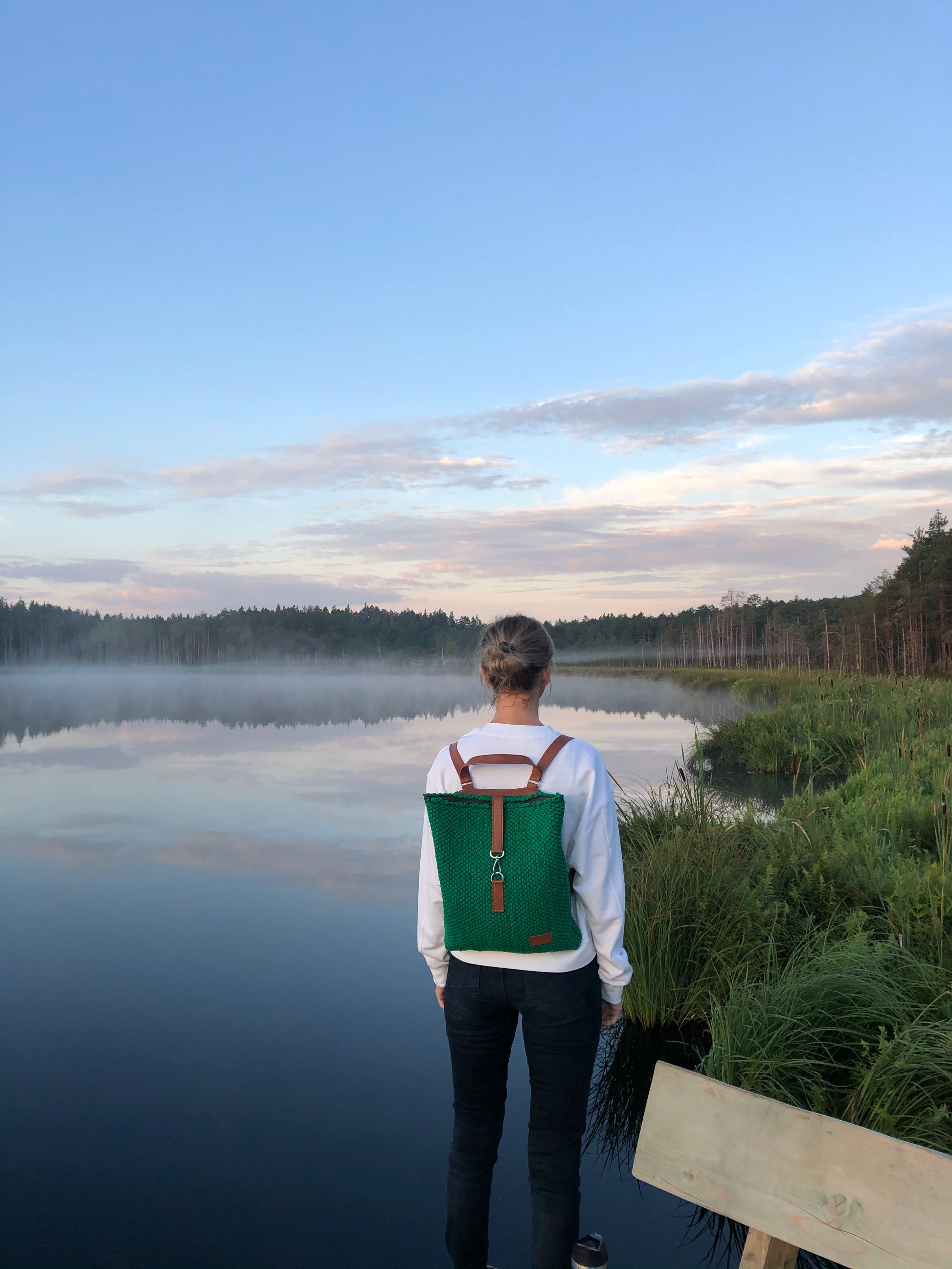 Kangastelgedel kootud seljakoti kangas on kaunis roheline. Seljakoti sangad ja detailid on kroomparknahast konjakpruuni värvi.