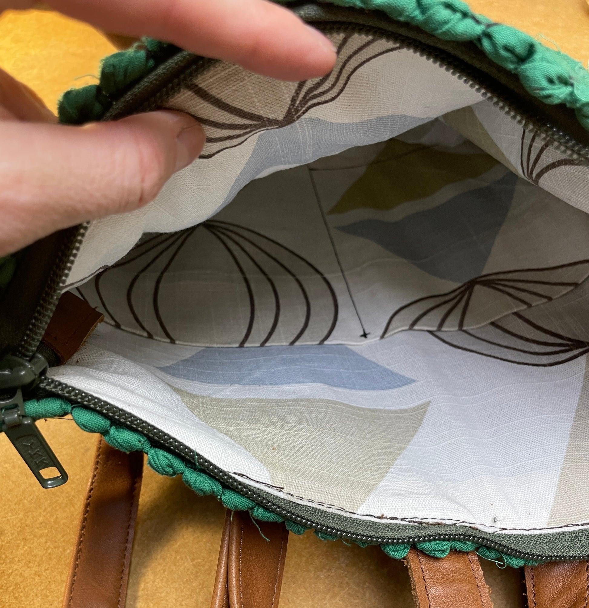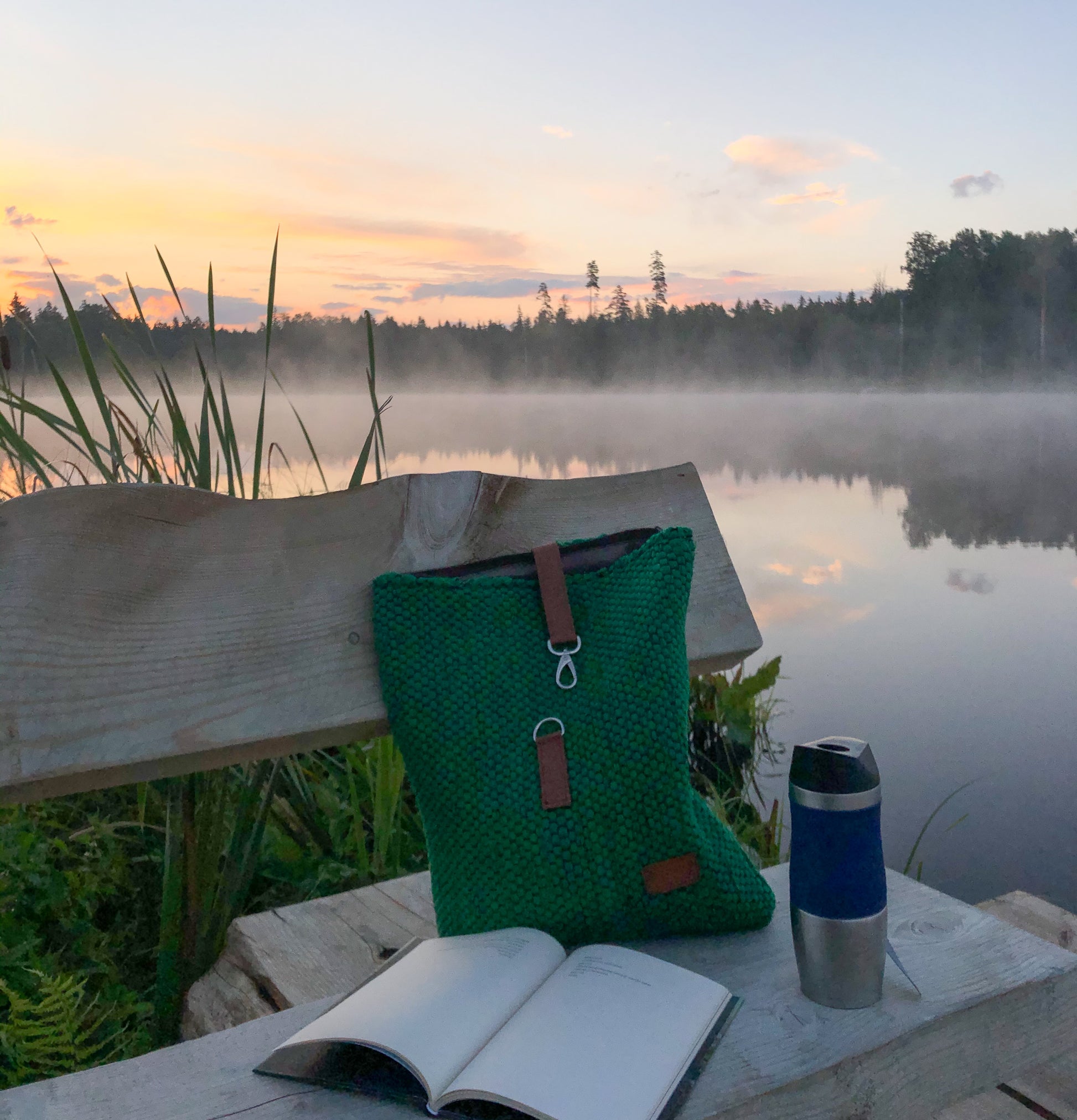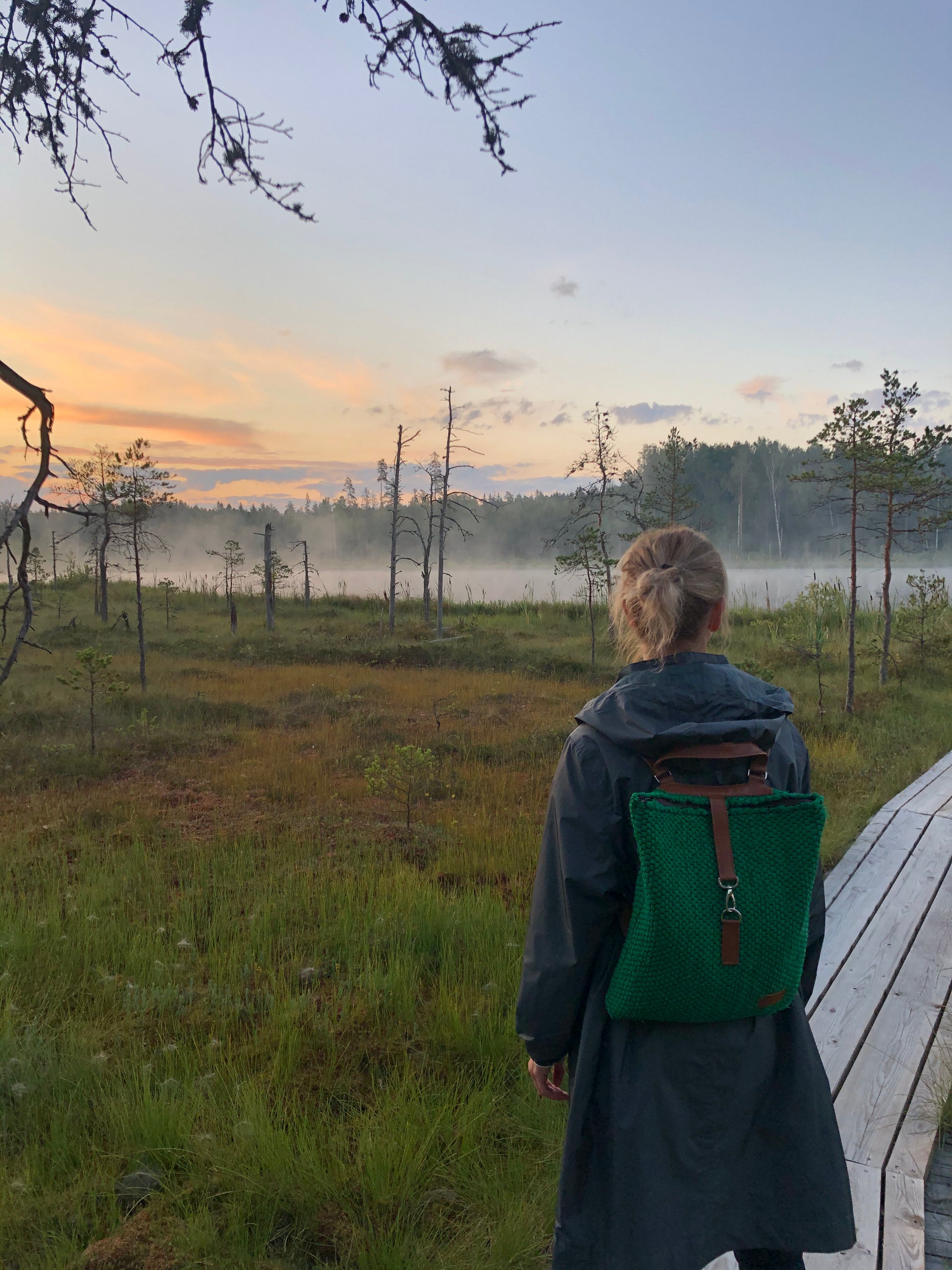 Kangastelgedel kootud seljakoti kangas on kaunis roheline. Seljakoti sangad ja detailid on kroomparknahast konjakpruuni värvi.