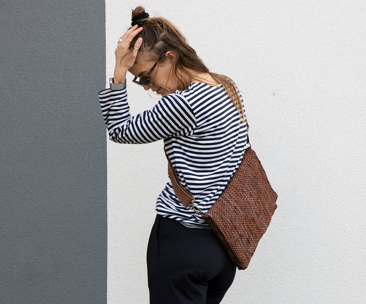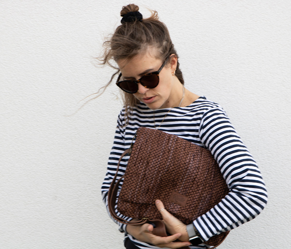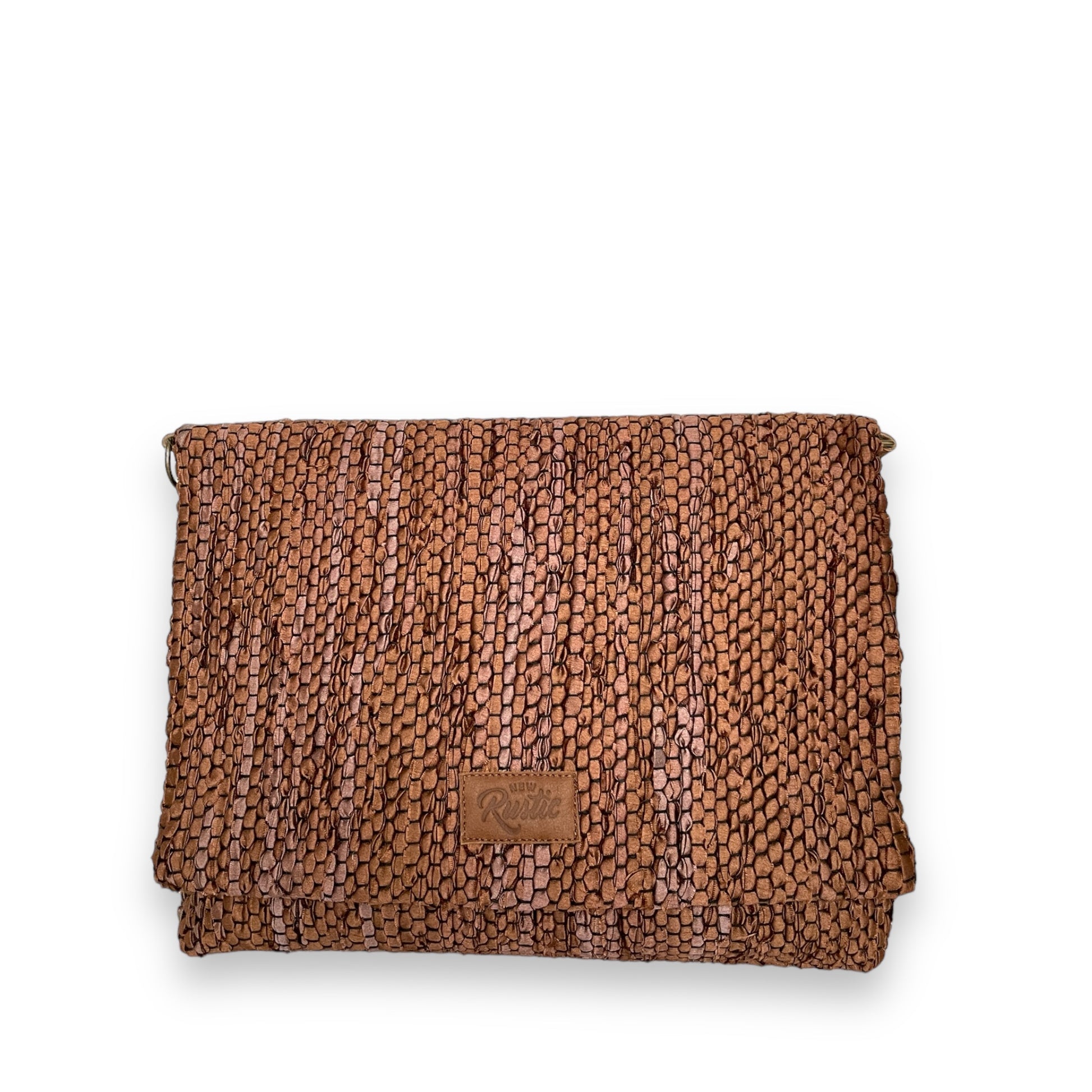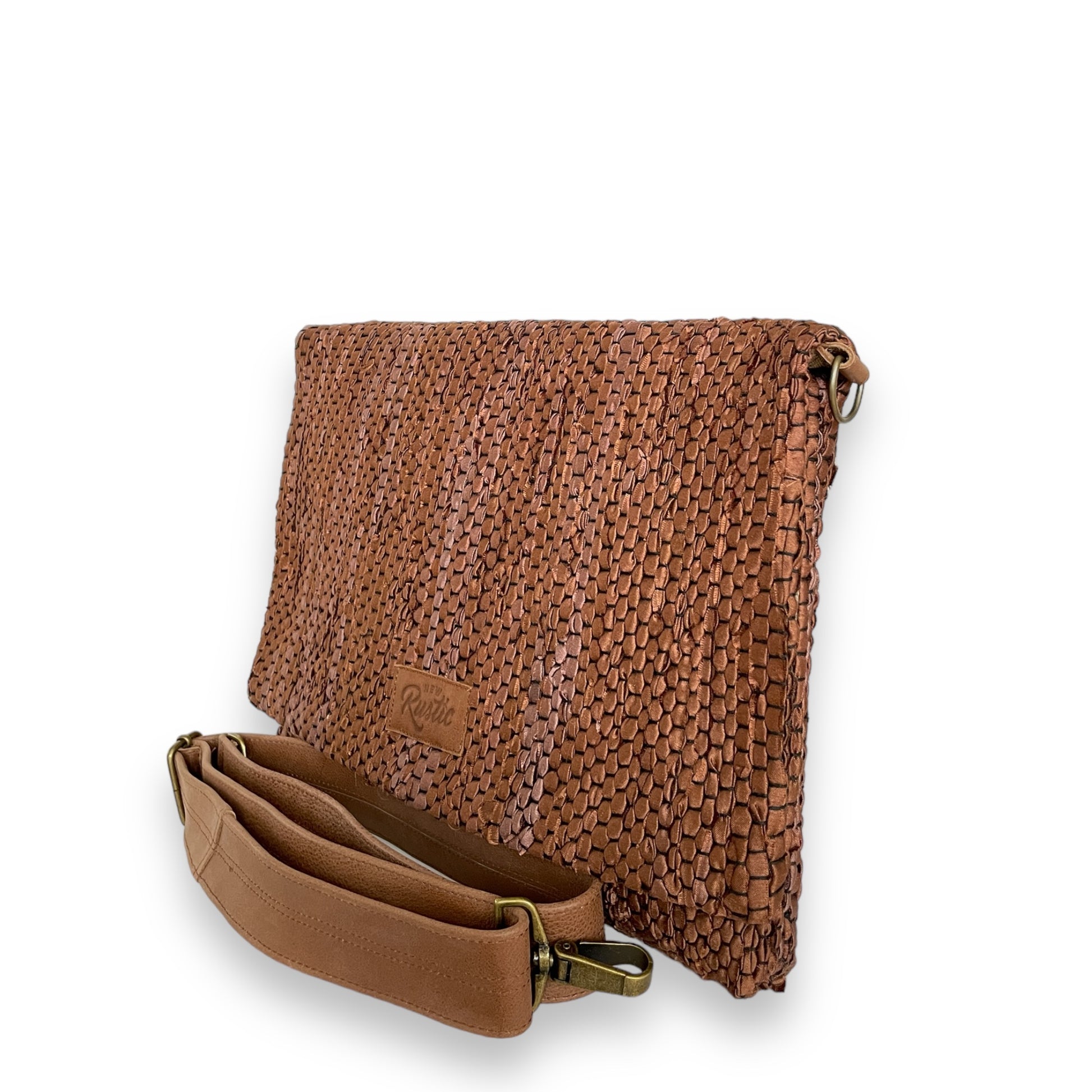 Koti kangas on kootud läikivast pronkspruunist polüesterkangast. Kott sulgub klapiga, sees on lukuga suletav tasku. Eemaldatav sang ja detailid on pehmest mandlipruunist nahast.