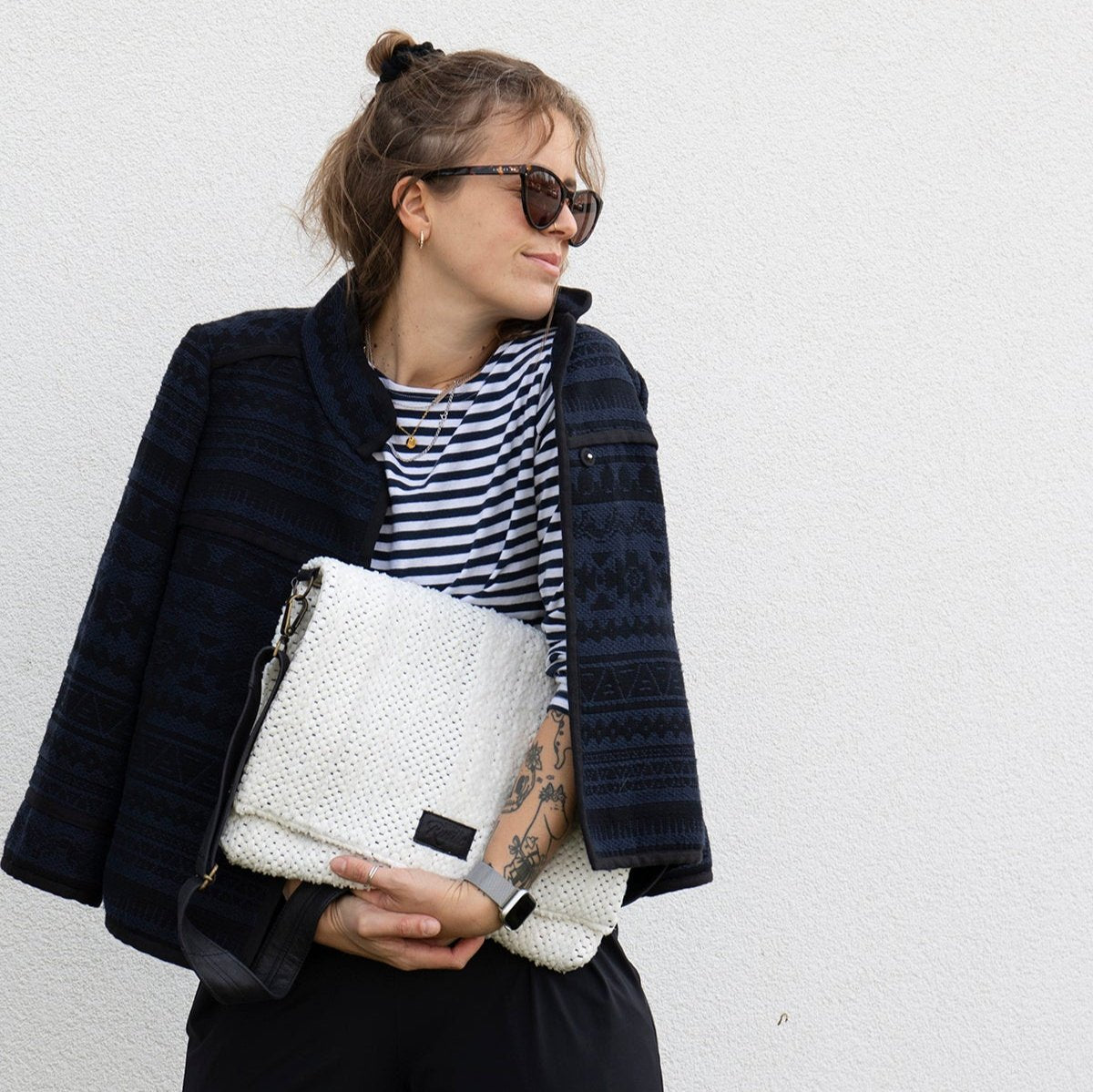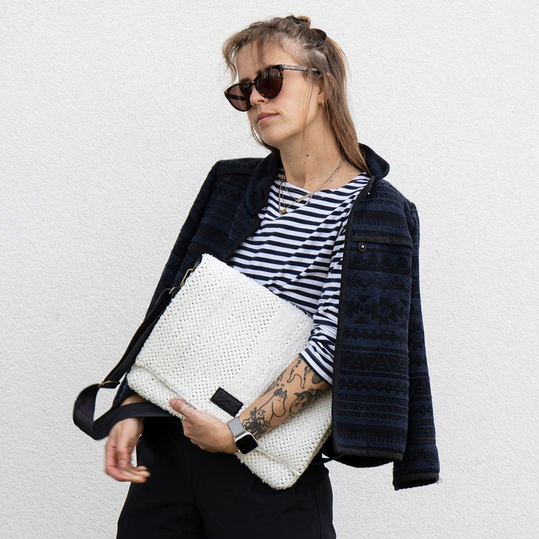 Koti kangas on kootud lumivalgest pehmest kangast. Kott sulgub klapiga, sees on lukuga suletav tasku. Eemaldatav sang ja detailid on mustast nahast.